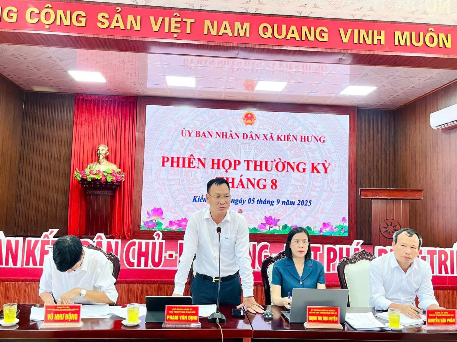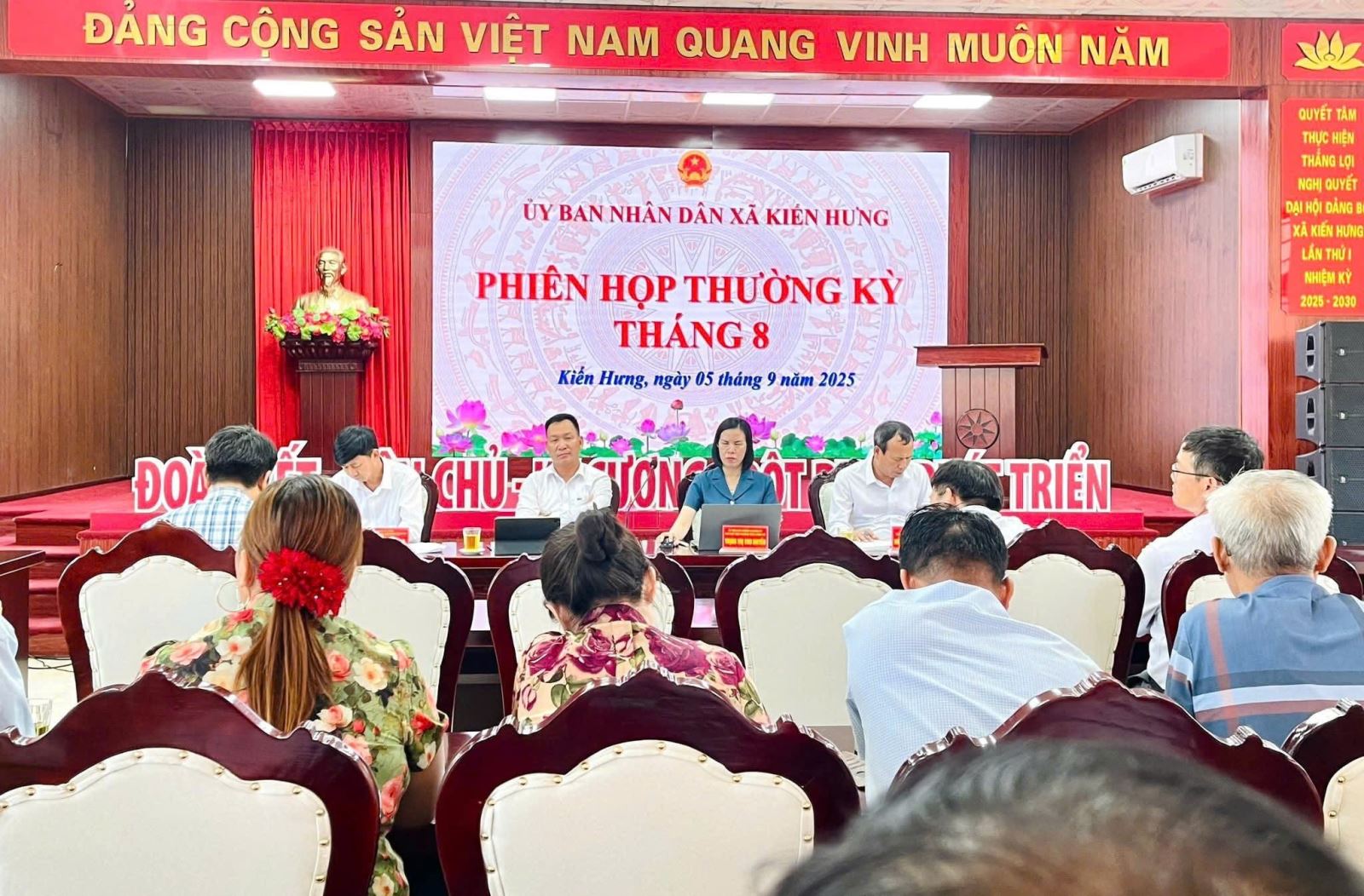 Thực hiện kế hoạch tổ chức các kỳ họp thường kỳ hàng tháng, chiều ngày 05/9/2025 tại trụ sở UBND xã Kiến Hưng đã tổ chức phiên họp thường kỳ tháng 8 nhằm đánh giá các chỉ tiêu kinh tế - xã hội - sản xuất nông nghiệp sau hai tháng thực hiện chính quyền 2 cấp.