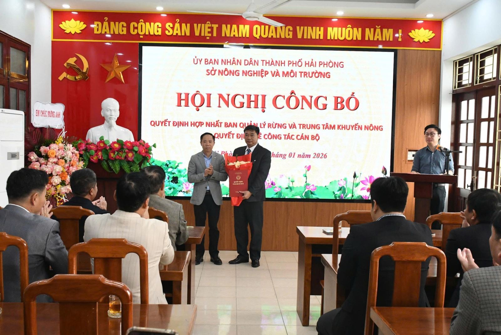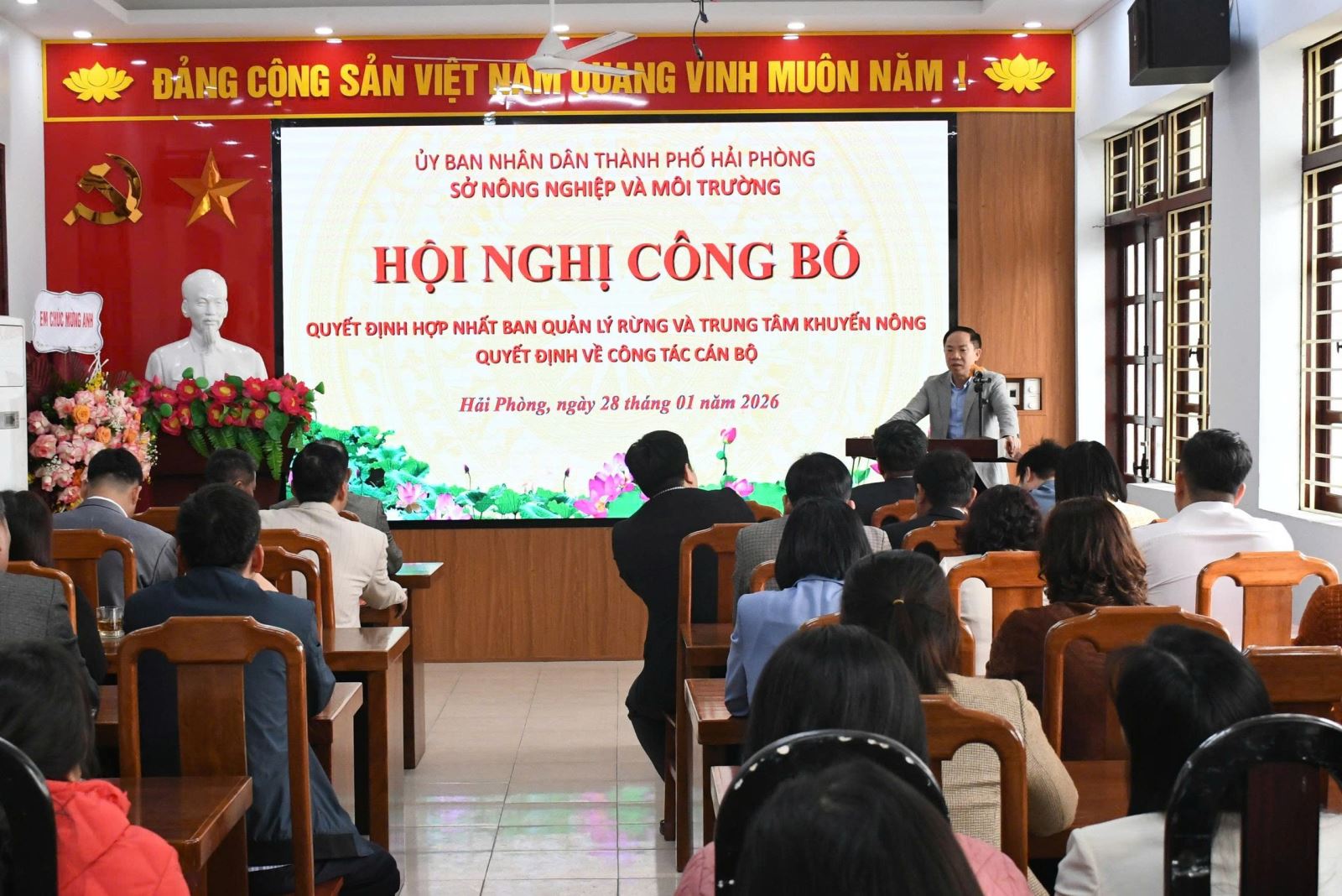 Hội nghị nhằm triển khai thực hiện Quyết định số 5378/QĐ-UBND ngày 31/12/2025 của Ủy ban nhân dân thành phố Hải Phòng về việc hợp nhất Ban Quản lý rừng và Trung tâm Khuyến nông, đồng thời quy định chức năng, nhiệm vụ, quyền hạn và cơ cấu tổ chức của Ban Quản lý rừng và Khuyến nông trực thuộc Sở Nông nghiệp và Môi trường.