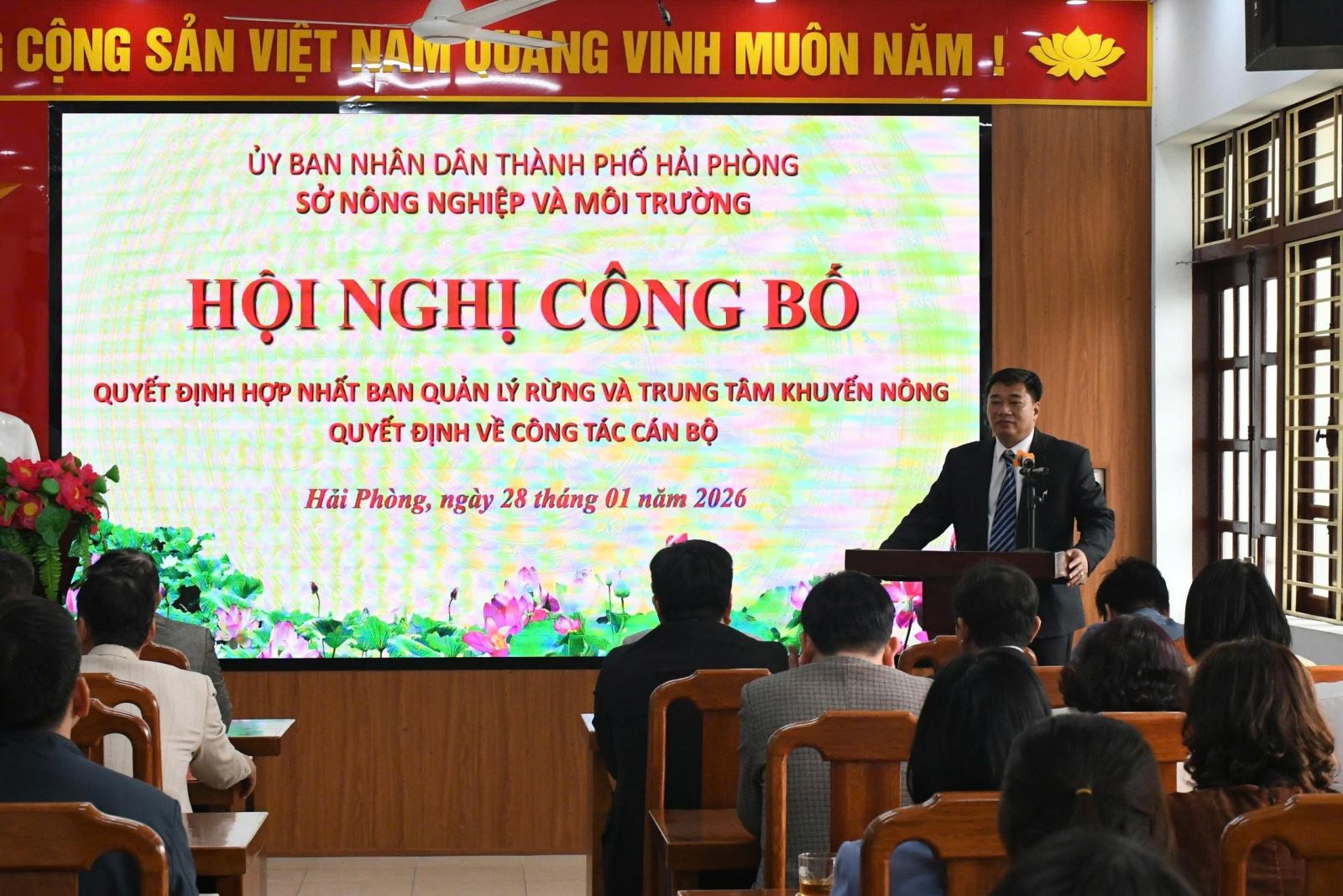 Tại Hội nghị, đồng chí Nguyễn Tuấn Ngọc đã công bố Quyết định Ủy ban nhân dân thành phố Hải Phòng về việc hợp nhất Ban Quản lý rừng và Trung tâm Khuyến nông, đồng thời quy định chức năng, nhiệm vụ, quyền hạn và cơ cấu tổ chức của Ban Quản lý rừng và Khuyến nông trực thuộc Sở Nông nghiệp và Môi trường. Công bố các quyết định về công tác cán bộ đối với lãnh đạo Ban Quản lý rừng và Khuyến nông sau khi thực hiện hợp nhất: Ông Bùi Đoàn Thể, nguyên Giám đốc Ban quản lý rừng giữ chức vụ Giám đốc Ban quản lý rừng và Khuyến nông và 6 Phó Giám đốc: Ông Nguyễn Phú Thụy, Bà Cao Thanh Huyền, Ông Ông Nguyễn Văn Tuyến, Ông Ngô Quang Trưởng, Ông Lưu Văn Cảnh, Ông Bùi Công Hiển.