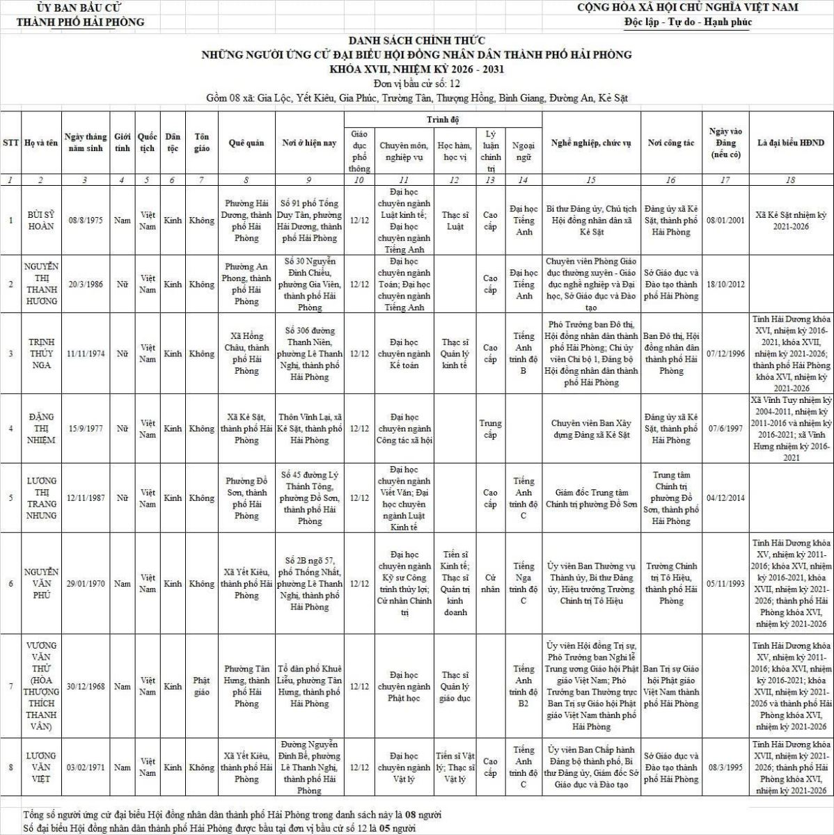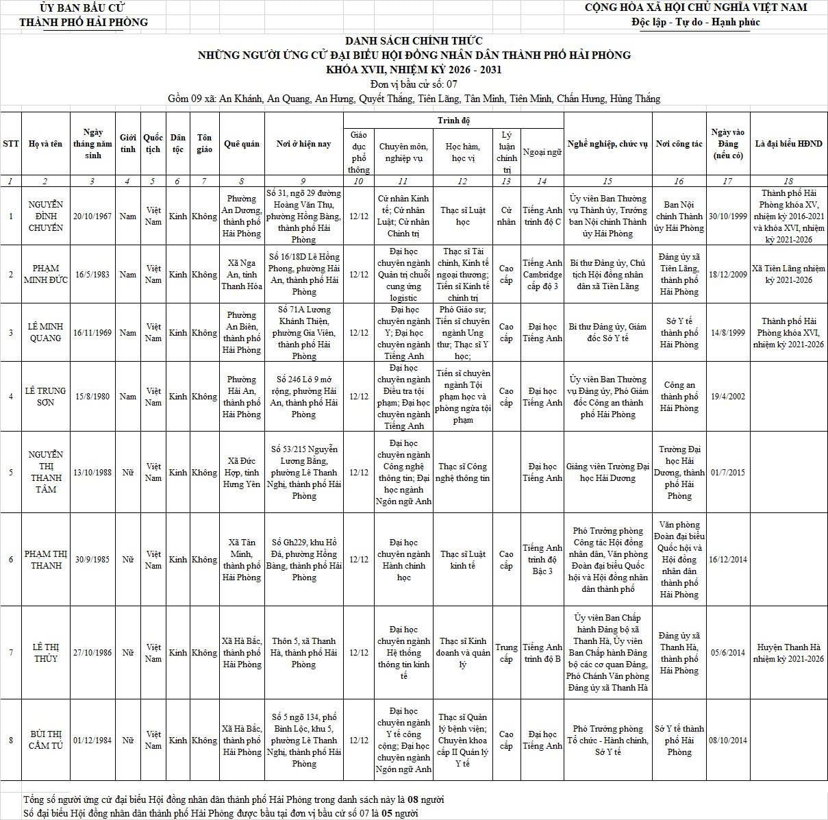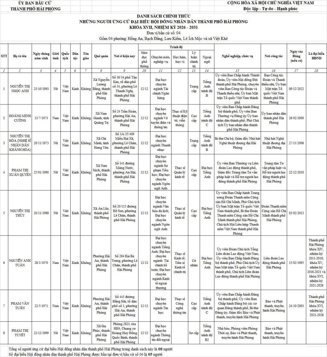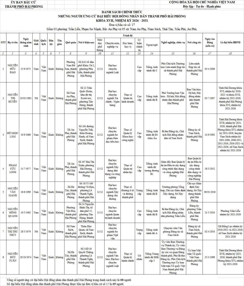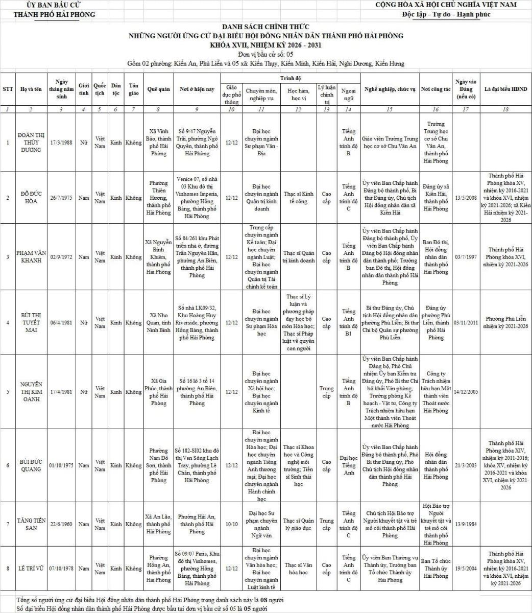 Chi tiết danh sách chính thức 139 người ứng cử đại biểu Hội đồng nhân dân thành phố Hải Phòng nhiệm kỳ 2026 - 2031 tại 18 đơn vị bầu cử:
