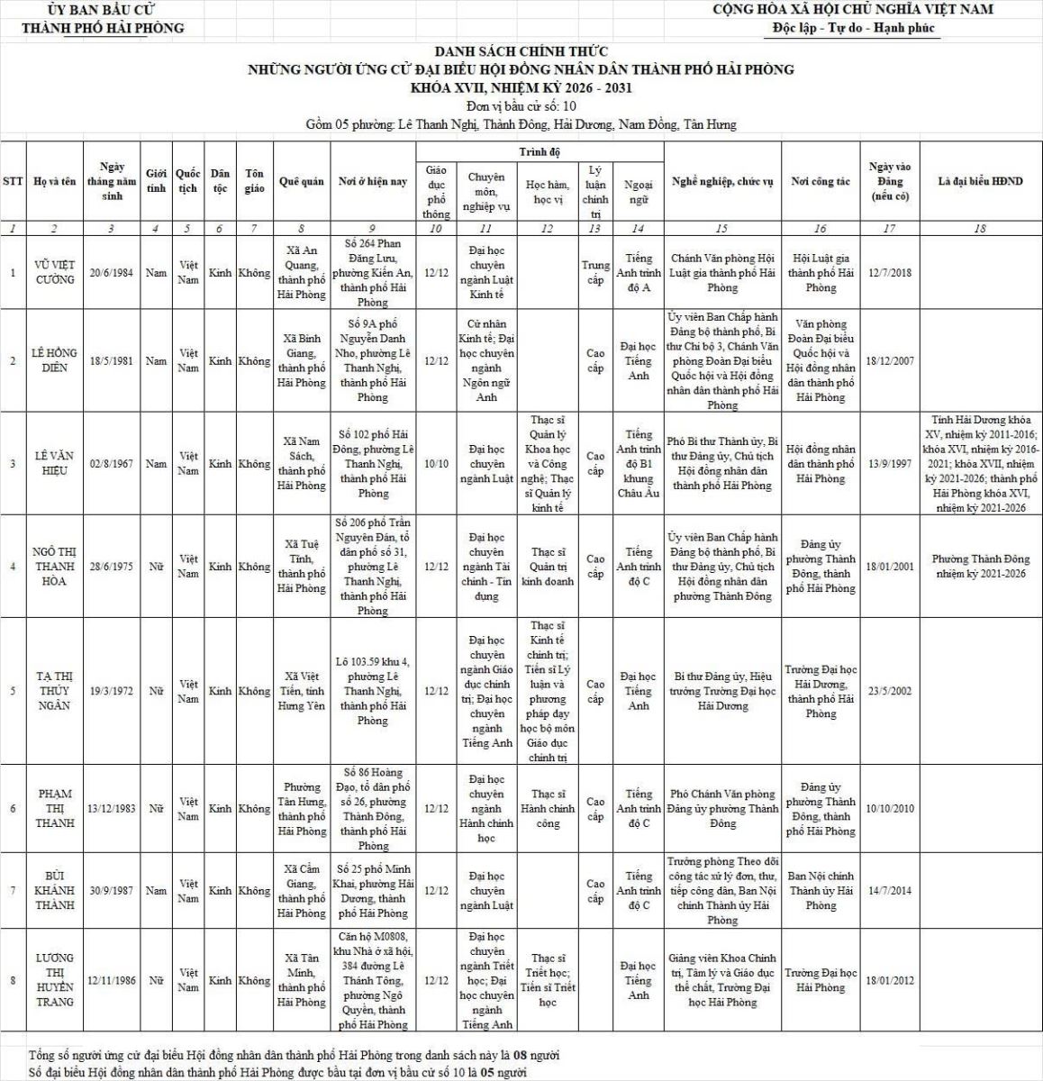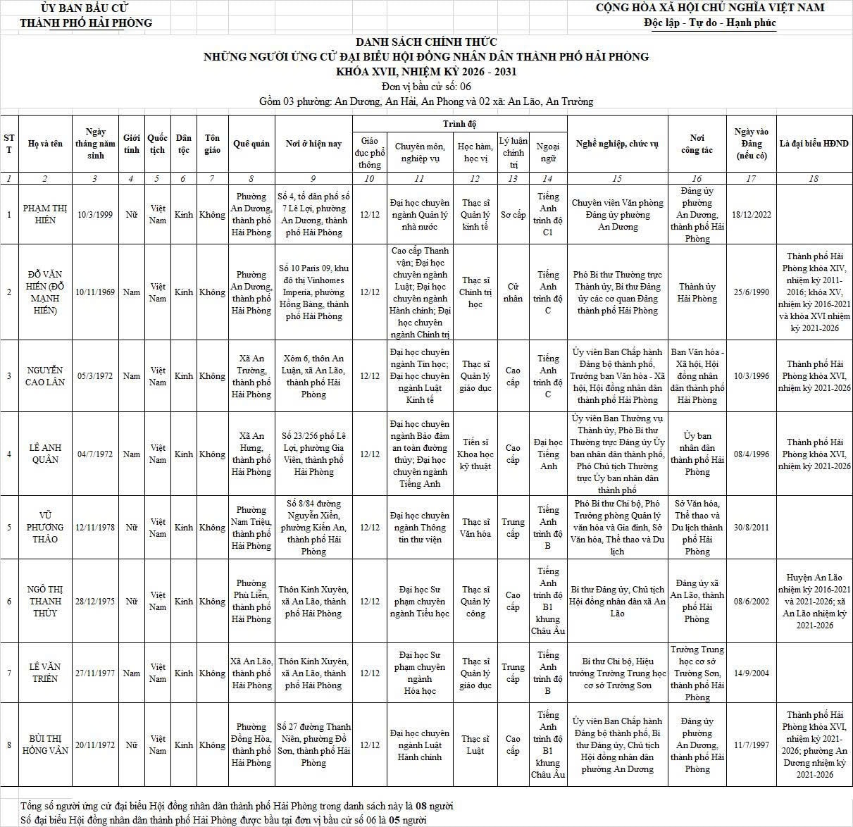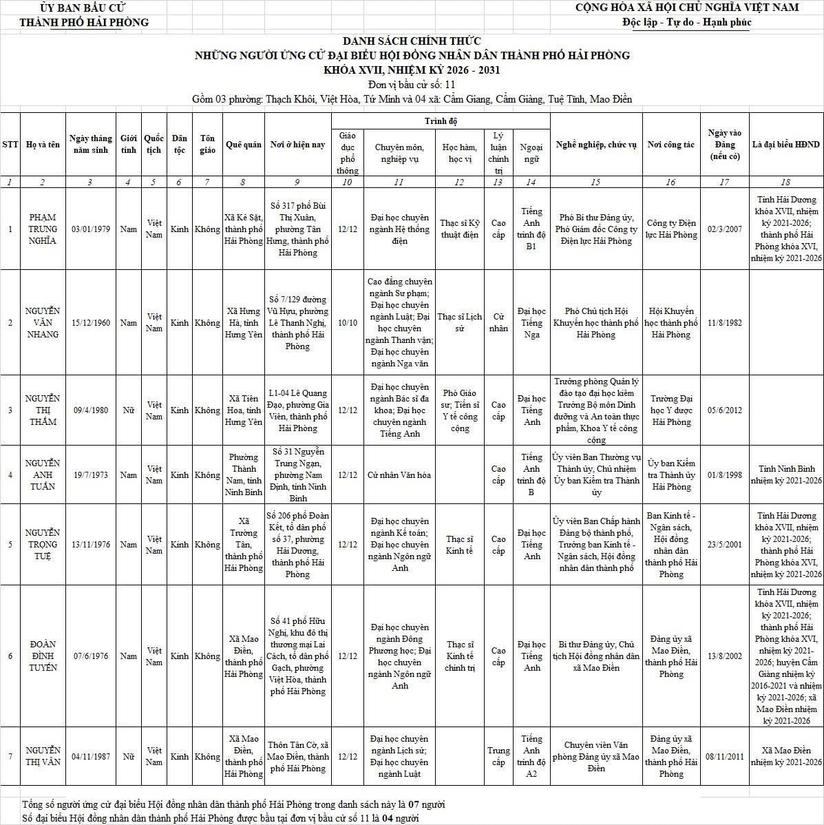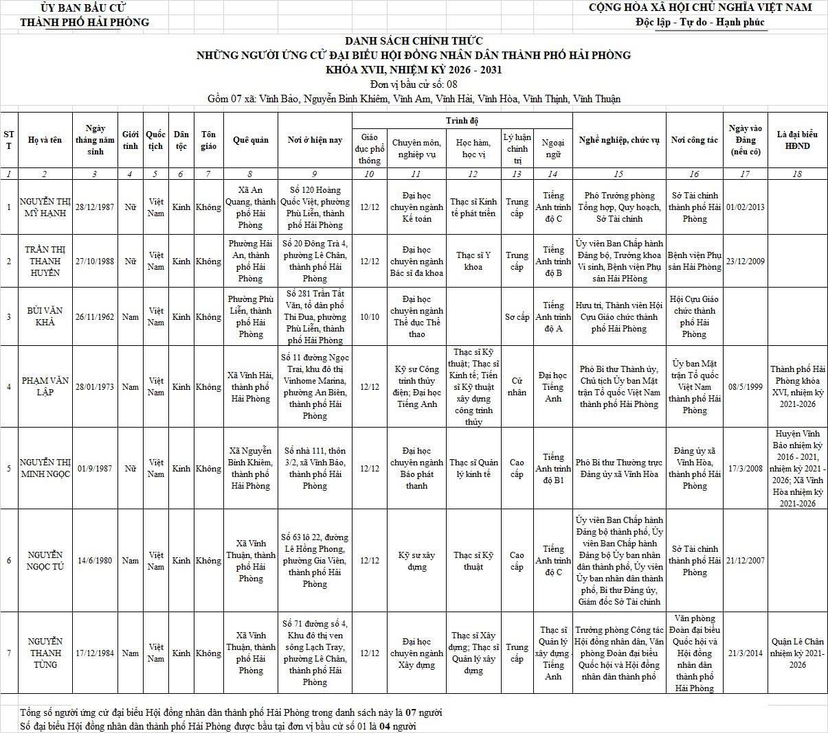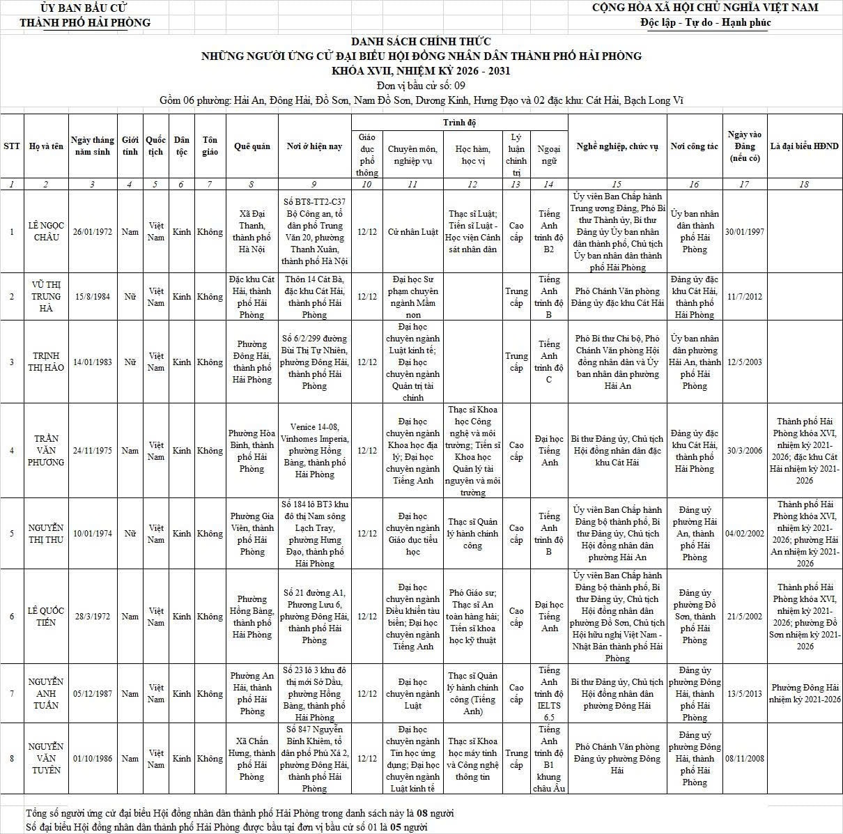 Chi tiết danh sách chính thức 139 người ứng cử đại biểu Hội đồng nhân dân thành phố Hải Phòng nhiệm kỳ 2026 - 2031 tại 18 đơn vị bầu cử: