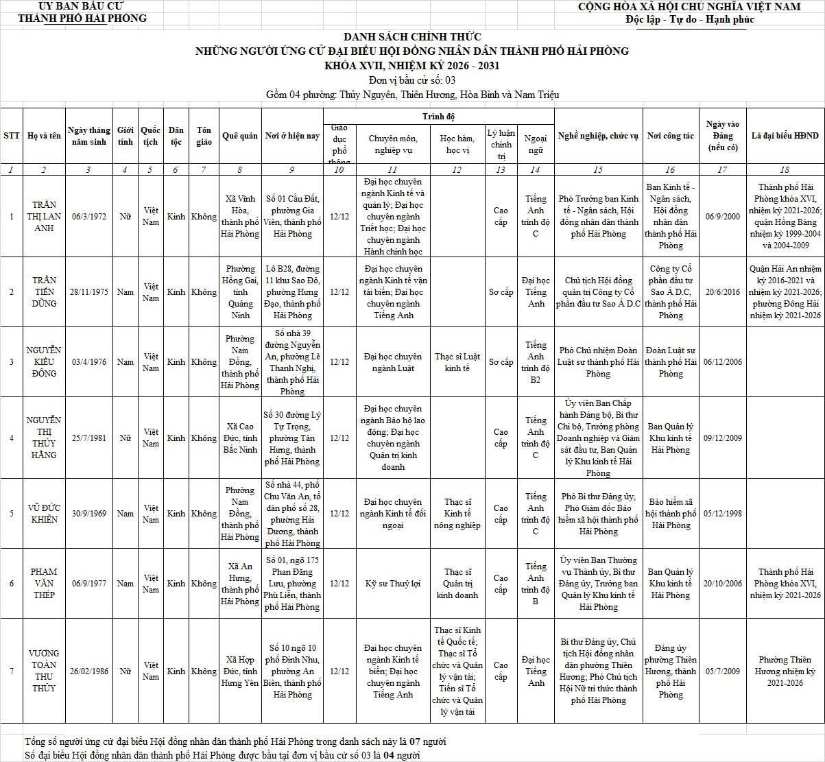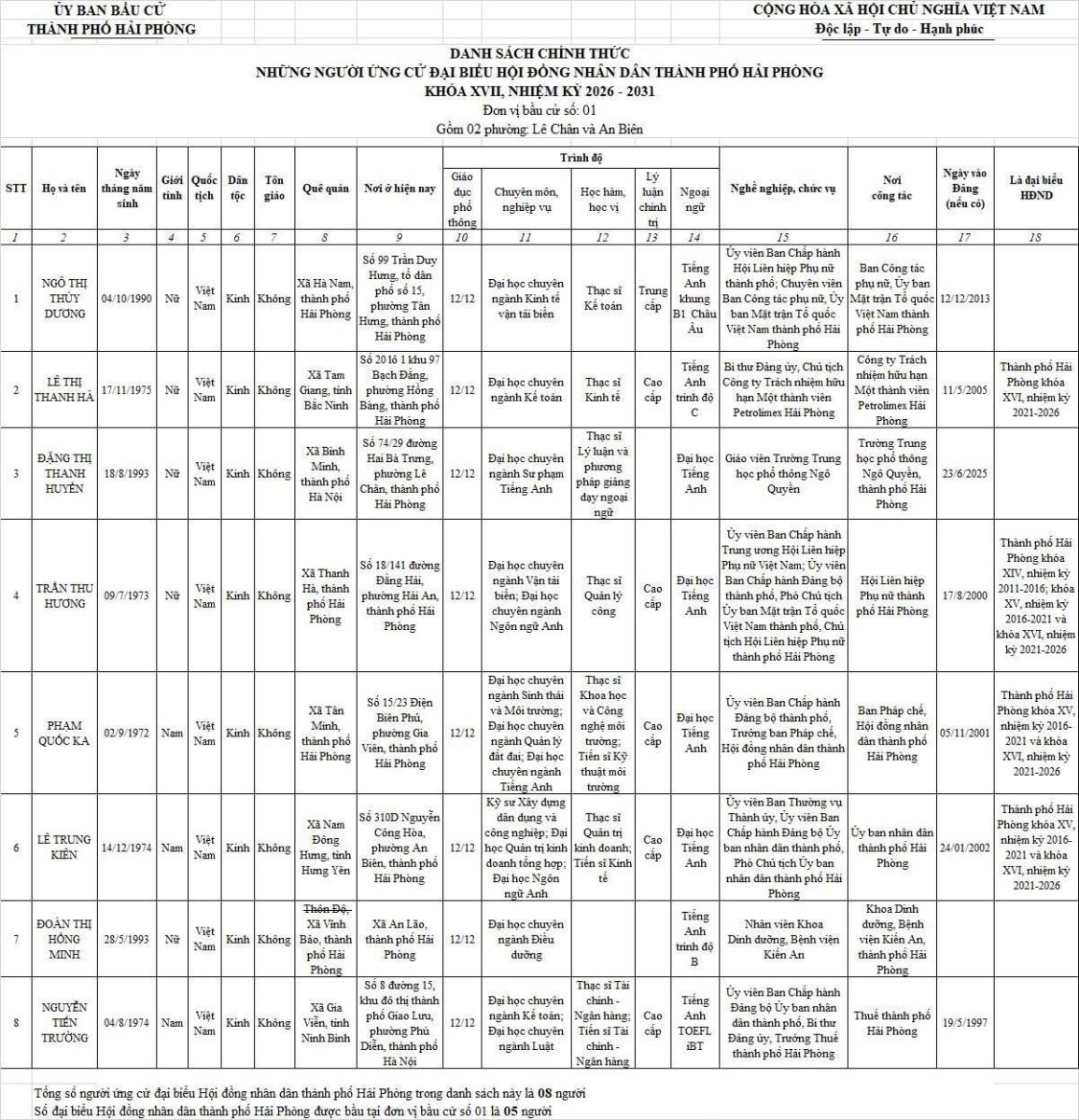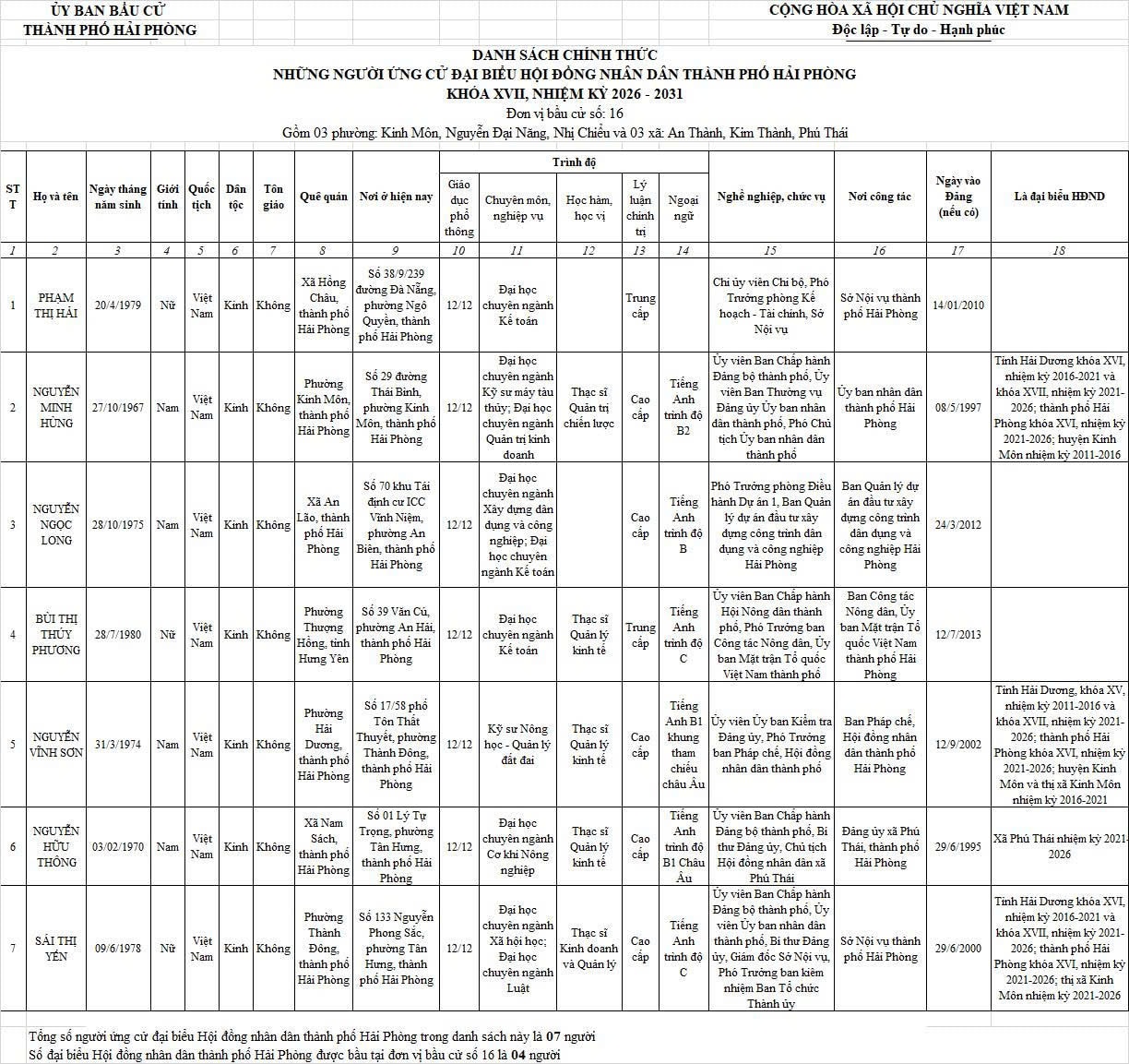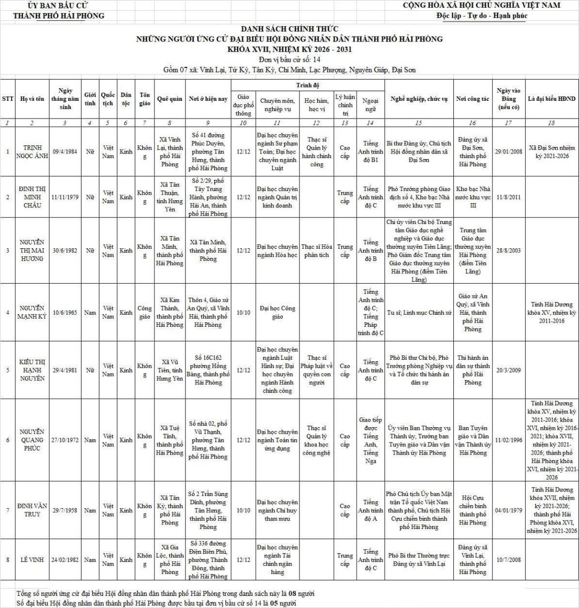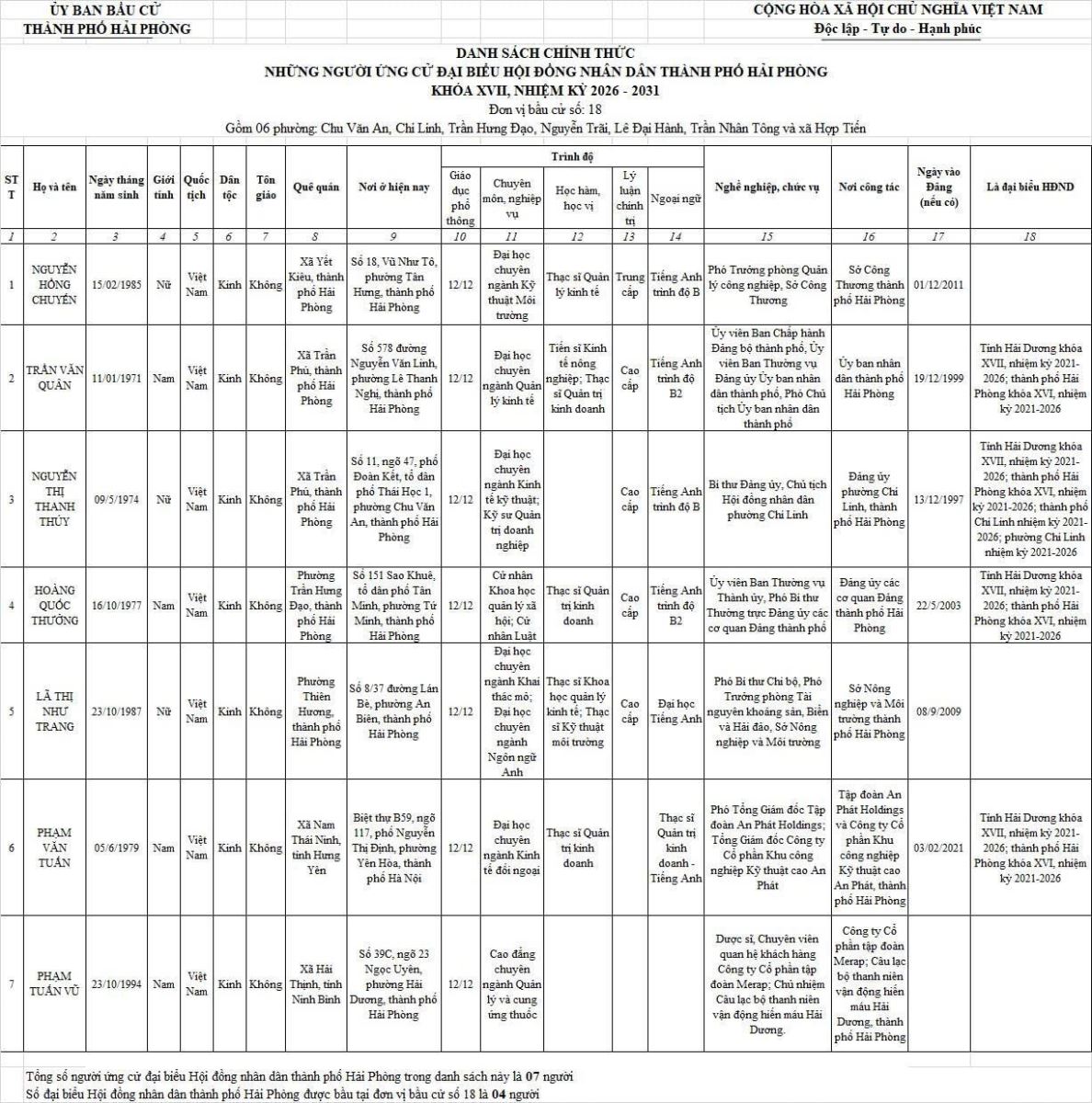 Chi tiết danh sách chính thức 139 người ứng cử đại biểu Hội đồng nhân dân thành phố Hải Phòng nhiệm kỳ 2026 - 2031 tại 18 đơn vị bầu cử: