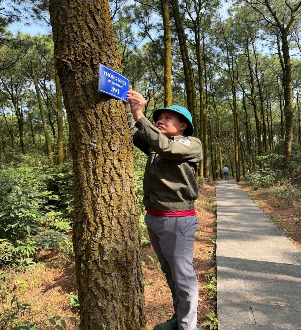 Để nâng cao hiệu quả quản lý và phục vụ tuyên truyền, đoàn công tác xác định việc treo biển nhận diện loài cây là cần thiết, giúp chuẩn hóa thông tin, theo dõi sinh trưởng và nâng cao nhận thức của du khách về đa dạng sinh học. Nội dung biển thể hiện rõ tên loài (ví dụ: Thông nhựa – Pinus latteri), mã số cây và các thông tin quản lý.