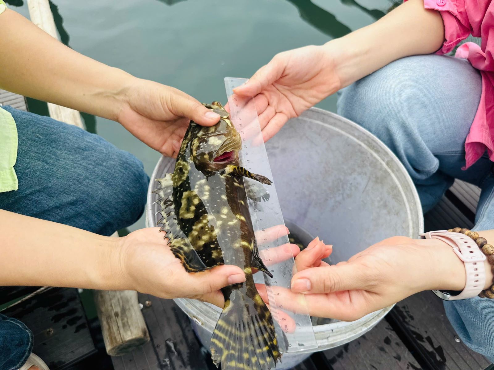 Cán bộ Khuyến nông cùng hộ nuôi kiểm tra tốc độ sinh trưởng của cá
