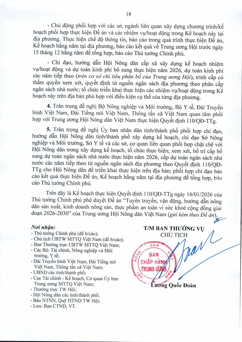 Kế hoạch thực hiện Quyết định số 110/QĐ-TTg ngày 16/01/2026 của Thủ tướng Chính phủ phê duyệt Đề án" Tuyên truyền, vận động, hướng dẫn NDSX, KD NS, TP AT vì sức khoẻ cộng đồng giai đoạn 2026-2030"
